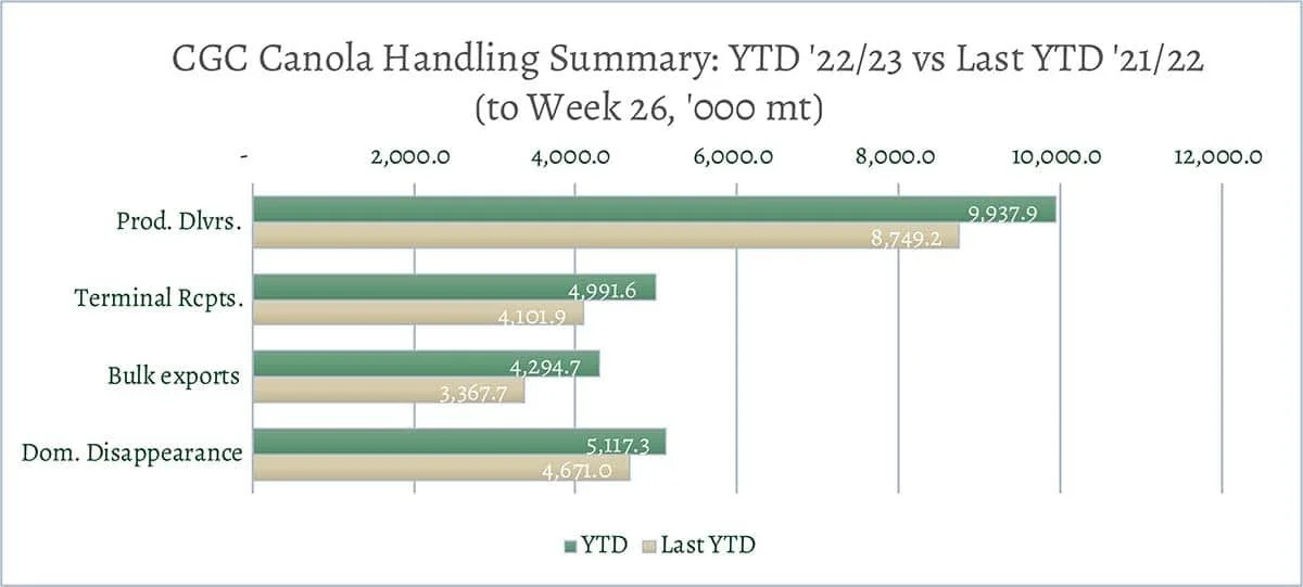 YTD canola disappearance into week 26 of the crop year is 17% above last year’s usage (+1.4 million MT) and amounted to 9.4 million MT compared to 8 million MT last year.