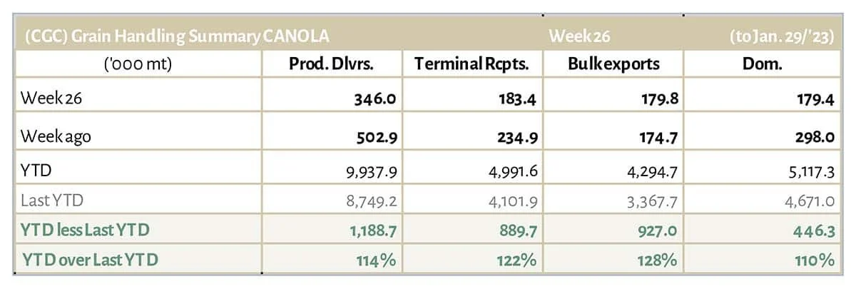 The Canadian Grain Commission reported that during week 26 of the crop year, growers delivered 346 thousand MT of canola into primary elevators, exports were at a 180 thousand MT, while the domestic disappearance amounted to a strong 179 thousand MT.