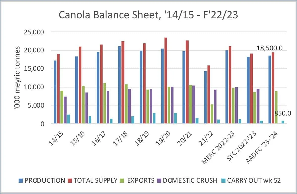 Re: new crop canola, AAFC projected a slight increase in acres for next year (+1.2%) to 21.75 million acres. The AAFC scenario shows 2023 Canadian canola production at 18.5 million MT (up just 1.8%). AAFC sees exports and crush close to this year’s, resulting in another small carry-out for 2023/24 at just 850 thousand MT [see graph].