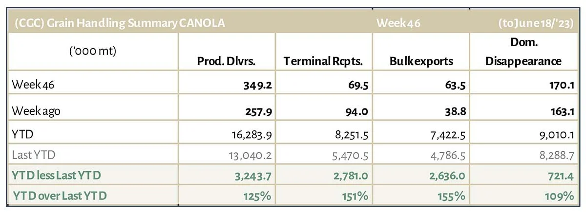The Canadian Grain Commission reported that during week 46 of the crop year, growers delivered 349 thousand MT of canola into primary elevators, exports were a small 64k MT, while the domestic disappearance amounted to 170 thousand MT.