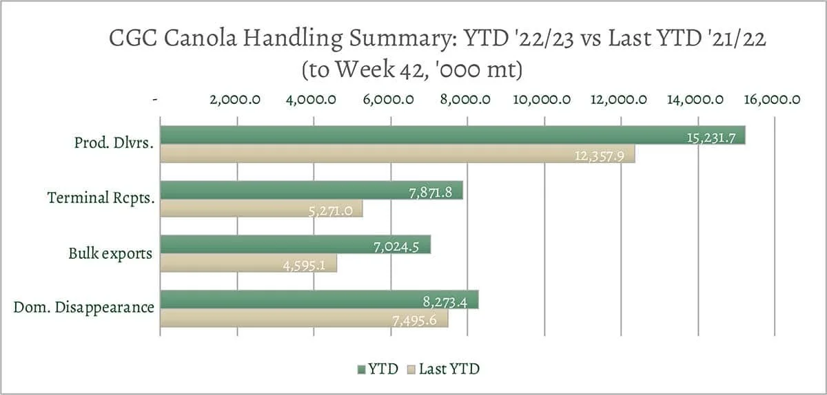 YTD canola disappearance into week 42 of the crop year is 27% above last year’s (drought-reduced) usage (+3.2 million MT) and amounted to 15.3 million MT compared to 12 million MT last year.