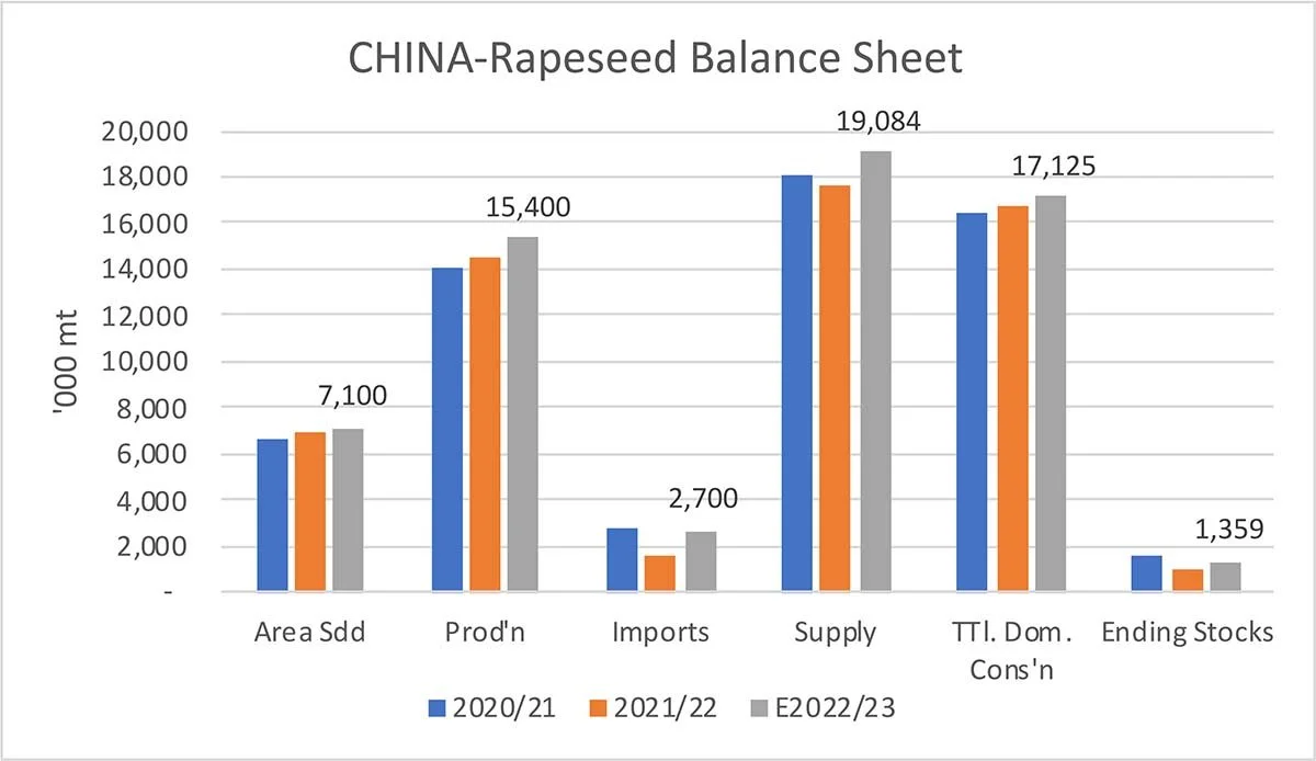 Based on the assessment and data of the USDA attaché in Beijing, China, rapeseed production in that country will increase by 7% and supply by 8% this crop year to 15.4 million MT and 19.1 million MT, respectively.