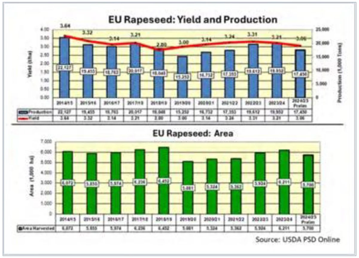According to the latest USDA numbers, the EU rapeseed production for 2024/25 is estimated at 17.5 million MT, down 200k MT from last month, and down 2.5 million MT (13%) from last year. Yield was estimated at 3.06 MT/ha, compared 3.21 MT/ha last year.