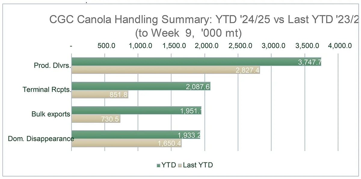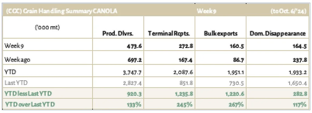 Canola: YTD total canola disappearance into week 9 of the crop year amounts to 3.9 million MT compared to 2.4 million MT last year and is up 63% on last year.