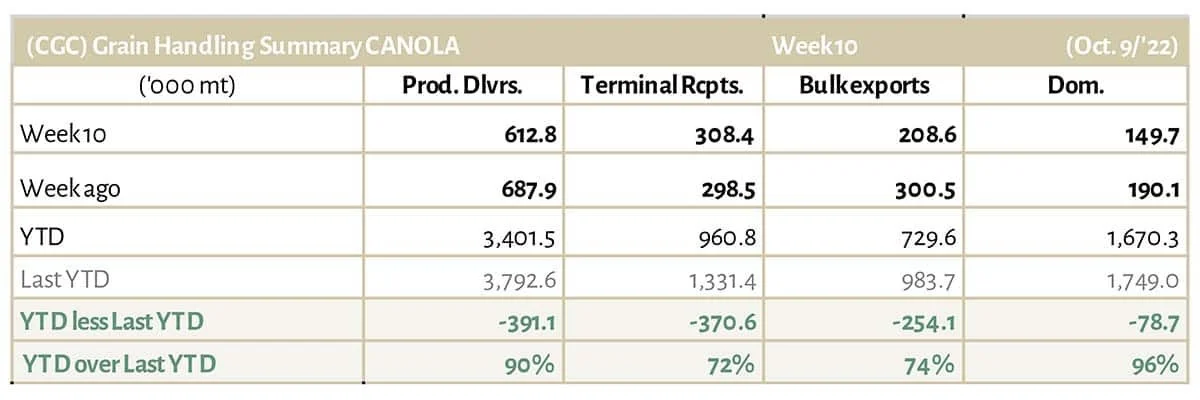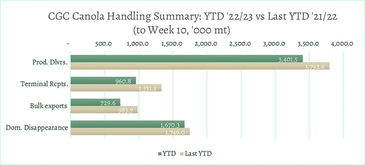Canola – YTD canola disappearance into week 10 of the crop year amounted to 2.4 million MT compared to 2.7 million MT last year.