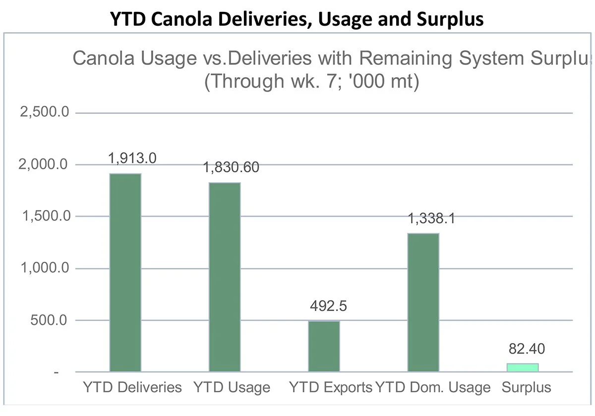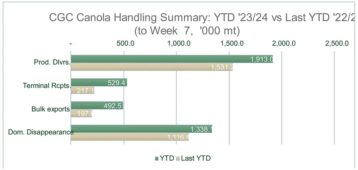 Canola: YTD canola disappearance into week 7 of the crop year amounted to 1.8 million MT compared to 1.3 million MT last year and is up 39% on last year.