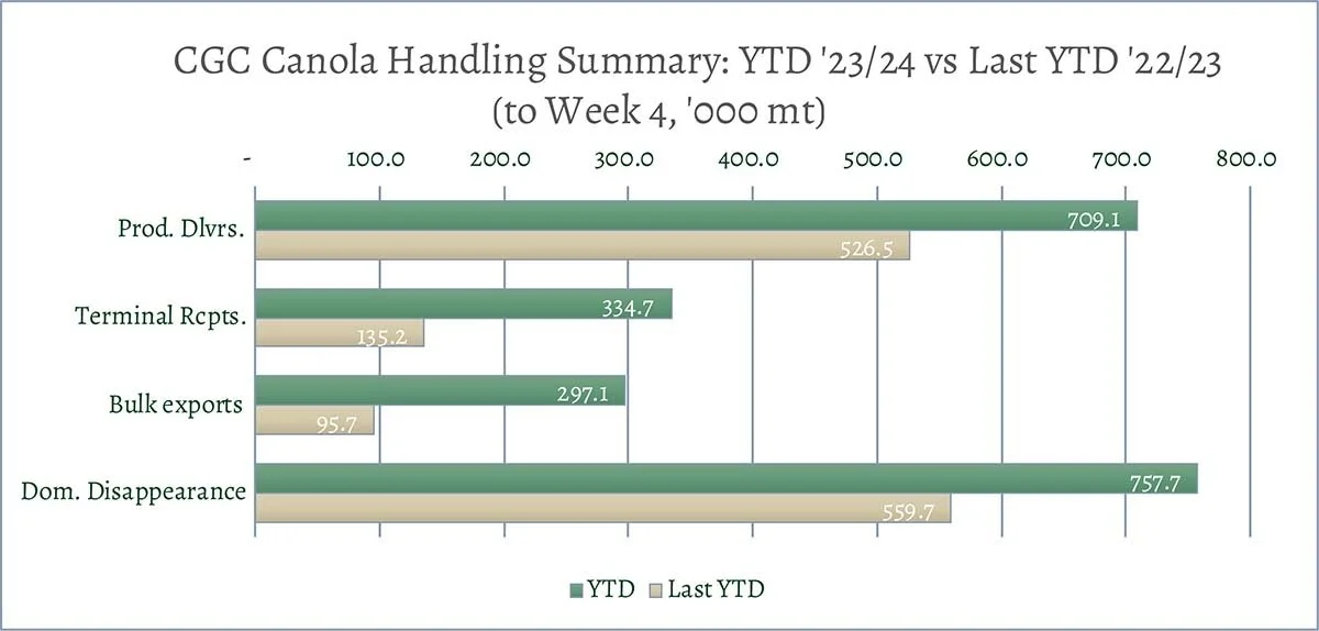 Canola: YTD canola disappearance (exports plus crush) into week 4 of the crop year amounted to 1 million MT compared to 655k MT last year and is up 61% on last year.
