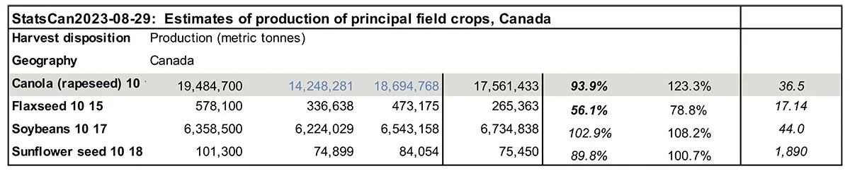 Also of note is the fact that StatsCan retroactively increased the previous canola production numbers for both 2021 and 2022 by 1.012 mln mt! StatsCan had materially underestimated the production for both years, and a correction was necessary to make the canola balance sheets balance! Both numbers are now close to our earlier numbers for those years.
